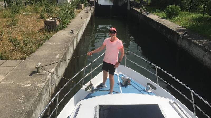 Bereits um 12:30 Uhr stehen wir vor der Schleuse Niffer wo wir auch sofort in die grosse Schleusenkammer einfahren können. Zeitlich perfekt abgestimmt fängt es während der Einfahrt in die Schleuse an zu regnen. Ab hier geht es wieder aufwärts und so können wir Niffer um 13:00 Uhr auch wieder verlassen, nicht ohne uns bei der netten Schleusenwärterin über Funk zu bedanken.