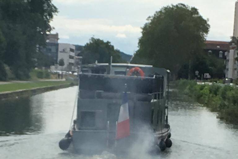Um 14:15 Uhr verlassen wir das lauschige Plätzchen wider und fahren weiter Richtung Mulhouse. Kurz vor der Schleuse befürchten wir von Piraten geentert zu werden. In dichten Rauch gehüllt fährt uns aus einem Seitenkanal steuerbords kommend ein Patroulienboot ähnliches Schiff vor den Bug und steuer ebenfalls auf die Schleuse zu. So ein Elend, nun haben wir diese Rauchpetarde in der Schleuse vor uns. Zu allem Unglück kann der Eigner nach eigener Aussage offenbar den Motor nicht ausmachen weil er sonst nicht mehr anspringen würde.