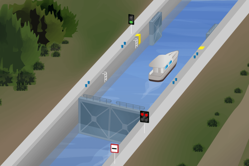 Animierte Grafik welche den Ablauf einer Tal- respektive Bergschleusung veranschaulichen soll